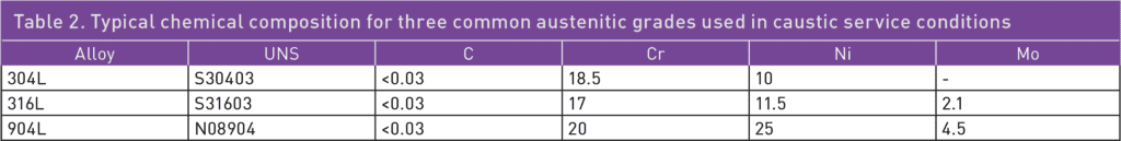 In caustic water solutions, such as sodium hydroxide (NaOH), chromium plays a crucial role in maintaining the passivity of stainless steels.1 Nitrogen is another beneficial alloying element for corrosion resistance, while a high nickel content can help reduce the corrosion rate in cases of active corrosion.1 The pulp and paper industry handles a lot of caustic solutions, and welded 304L, with approximately 18% chromium and 10% nickel, offers a good service life for piping. In such piping applications, the caustic concentration is seldom higher than 30% NaOH, and the temperature is usually below 80°C. However, as shown in Table 1, when exposed to higher temperatures, 304L can start to corrode, and there is also a risk of stress corrosion cracking (SCC) at atmospheric boiling points.2 Since 316L is usually slightly lower in chromium content than 304L, and also suffers from SCC at similar temperatures, 316L does not offer any advantages compared to 304L. Additionally, the higher-alloyed austenitic stainless steel grade 904L is susceptible to SCC when exposed to boiling 30% NaOH solution. The typical chemical compositions of 304L, 316L, and 904L stainless steel are listed in Table 2.