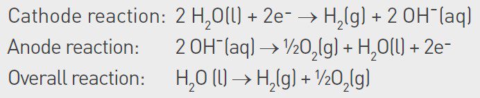 This article focuses on alkaline electrolyzer technology, which today is the most used or considered technology for large-scale hydrogen plants. In alkaline electrolyzers, as suggested by the name, the electrolyte is a caustic solution, commonly 30% potassium hydroxide (KOH). The water in the electrolyte is split into oxygen and hydrogen through the reactions summarized below: