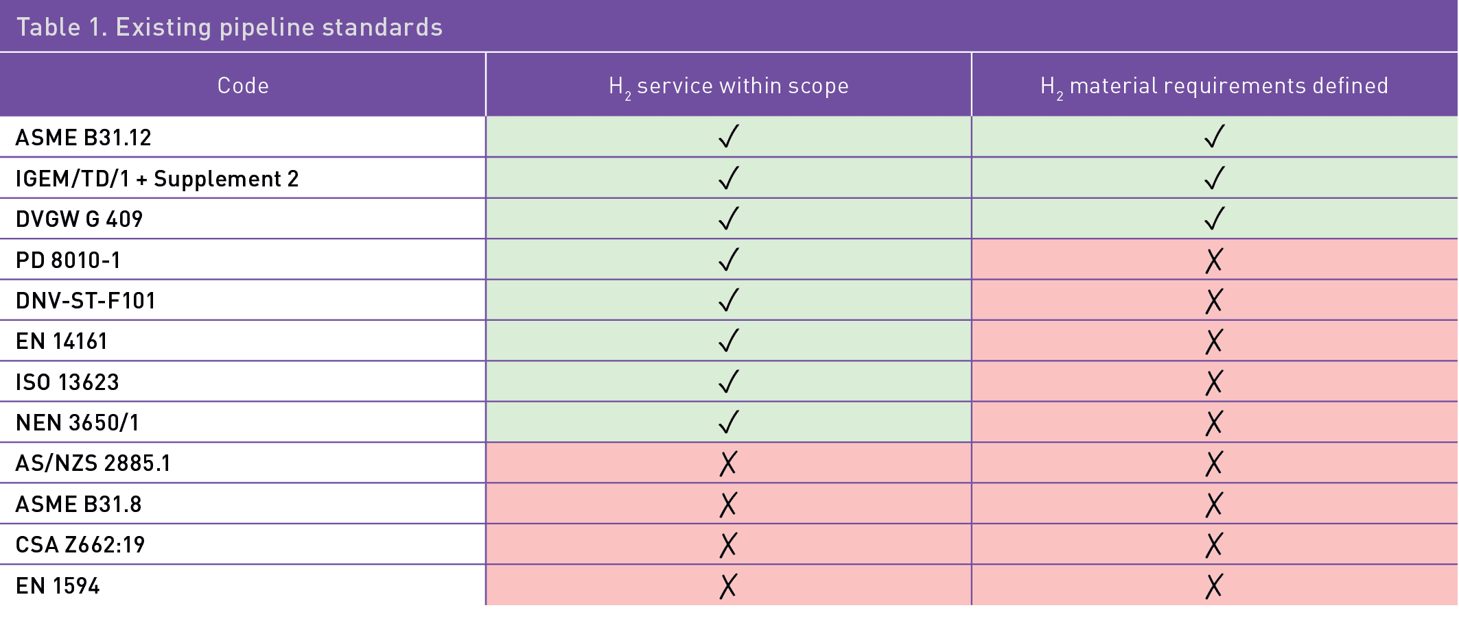 The pipeline codes and standards currently available provide limited guidance on repurposing to hydrogen service, with ASME B31.12 commonly considered the governing standard for hydrogen. Table 1 shows the extent of code coverage of hydrogen systems.