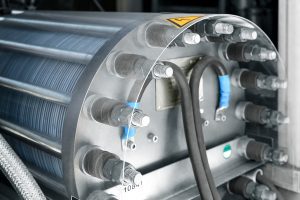 The Cummins’ website provides a handy description of the proton exchange membrane electrolysis process as follows: PEM electrolysis creates a reaction using an ionically conductive solid polymer, rather than a liquid. When voltage is applied between two electrodes, negatively charged oxygen in the water molecules gives its electron, resulting in protons, electrons, and O2 at the anode.